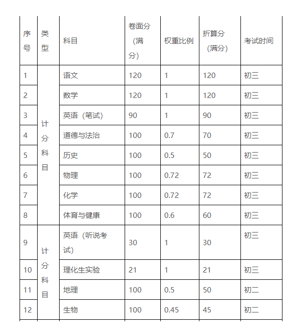 初三考试科目共8科,分别为:语文、数学、英语(含听说考试)、道德与法治、物理、化学、历史、体育与健康,另理化生实验单独组织考试。计分办法与权重见表2。